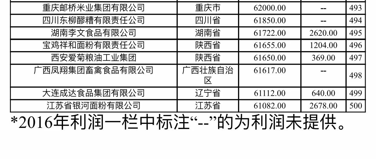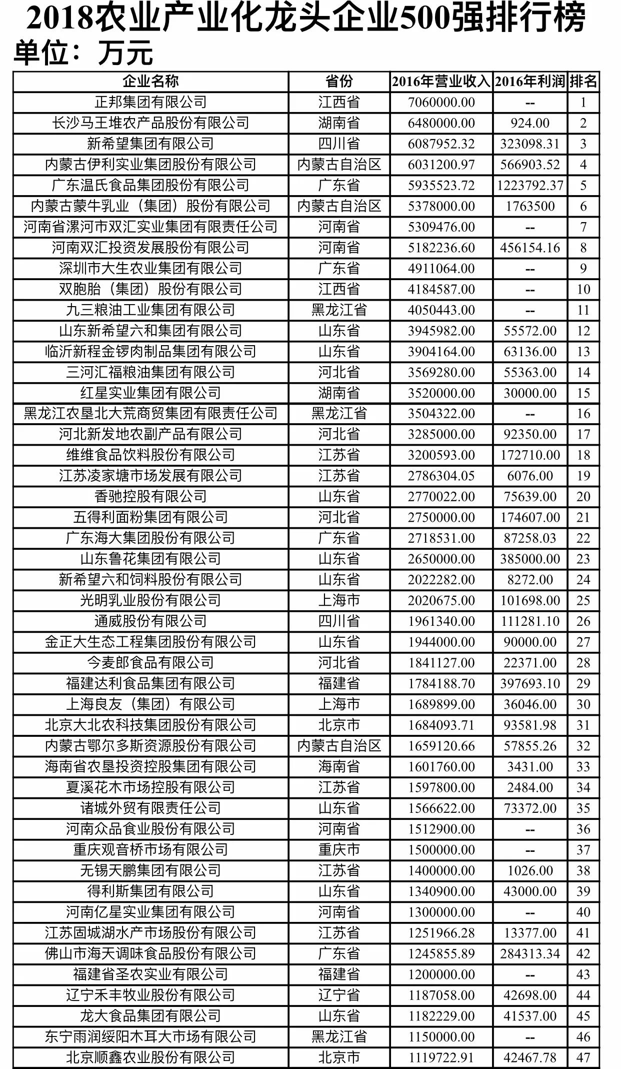 新型農(nóng)業(yè)經(jīng)營(yíng)主體是發(fā)展現(xiàn)代農(nóng)業(yè)和實(shí)現(xiàn)鄉(xiāng)村振興的重要力量。為全面了解各類新型農(nóng)業(yè)經(jīng)營(yíng)主體的發(fā)展情況,在相關(guān)主管部門和各省區(qū)市的大力支持下,農(nóng)民日?qǐng)?bào)社組織權(quán)威專家開展課題研究,并采集和梳理大量數(shù)據(jù),依據(jù)2016年?duì)I業(yè)收入進(jìn)行排名,入圍門檻為6.11億元,綜合形成了《2018農(nóng)業(yè)產(chǎn)業(yè)化龍頭企業(yè)500強(qiáng)排行榜》。