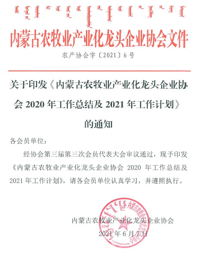 標題:關于印發(fā)《內(nèi)蒙古農(nóng)牧業(yè)產(chǎn)業(yè)化龍頭企業(yè)協(xié)會2020年工作總結(jié)及2021年工作計劃》的通知