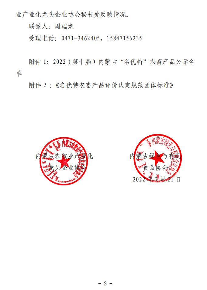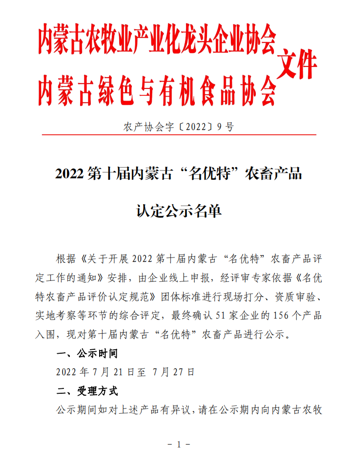 標(biāo)題:2022第十屆內(nèi)蒙古“名優(yōu)特”農(nóng)畜產(chǎn)品認(rèn)定公示名單