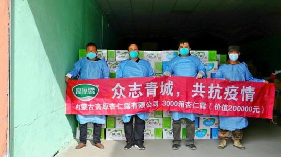 20、常務(wù)理事單位-內(nèi)蒙古高原杏仁露有限公司:近日,內(nèi)蒙古高原杏仁露有限公司向玉泉區(qū)捐贈了價值12萬余元的高原杏仁露,本次捐贈表達(dá)了對所有抗疫工作人員的熱切關(guān)懷和暖暖情意,感謝所有逆行者“疫”無反顧的擔(dān)當(dāng)與堅守。