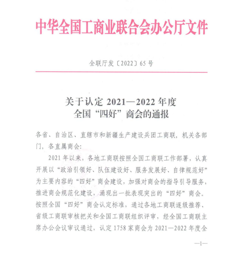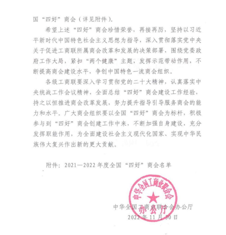 近日,中華全國工商業(yè)聯(lián)合會辦公廳發(fā)布《關于認定20212022年度全國“四好”商會的通報》,通報指出,按照全國“四好”商會認定標準,在各地工商聯(lián)逐級推薦、省級工商聯(lián)審核把關、全國工商聯(lián)組織評審的基礎上,經全國工商聯(lián)主席辦公會議審議通過,評選出2021-2022年度全國“四好”商會。內蒙古農牧業(yè)產業(yè)化龍頭企業(yè)協(xié)會等42家商(協(xié))會榮獲2021-2022年度全國“四好”商會榮譽稱號!