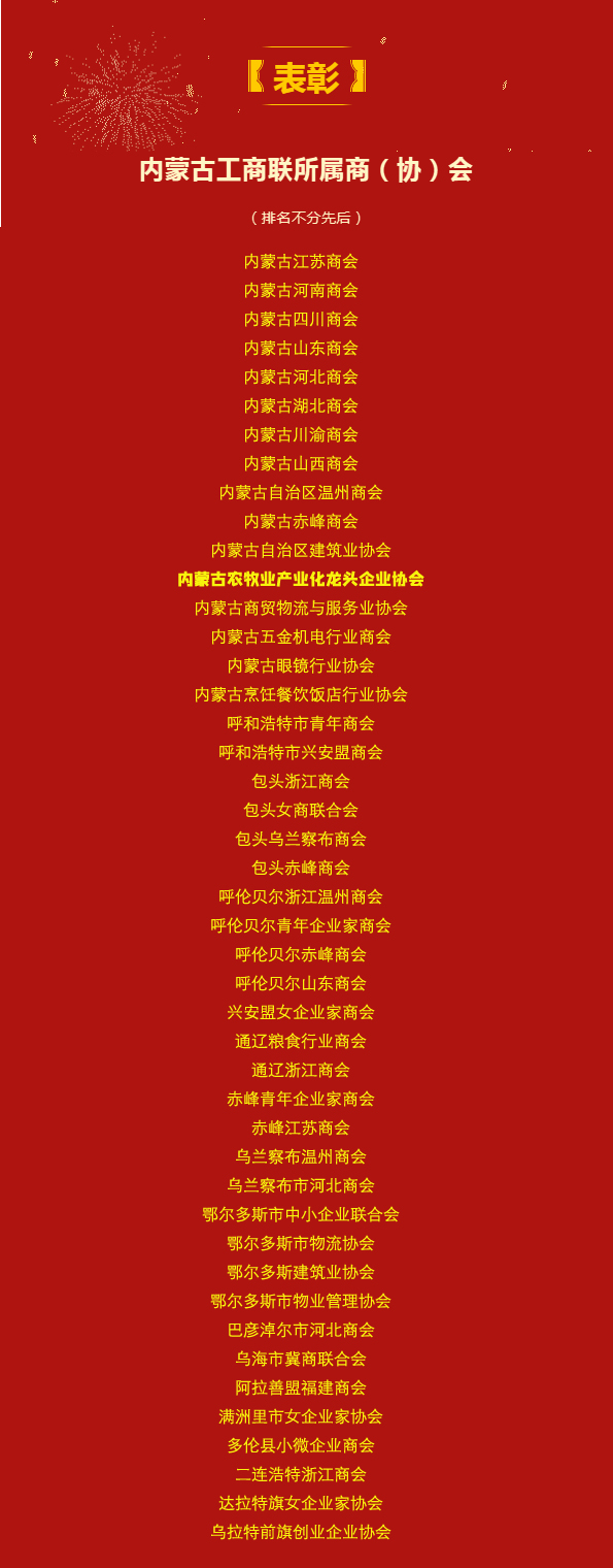 內(nèi)蒙古農(nóng)牧業(yè)產(chǎn)業(yè)化龍頭企業(yè)協(xié)會已連續(xù)三年獲此殊榮!在接下來的工作中,協(xié)會將珍惜榮譽,再接再厲,堅持以習近平新時代中國特色社會主義思想為指導,深入貫徹落實黨中央關(guān)于商會改革和發(fā)展的決策部署,圍繞內(nèi)蒙古自治區(qū)黨委政府工作大局,緊扣“兩個健康”主題,充分發(fā)揮協(xié)會示范帶動作用,踐行協(xié)會的社會責任擔當,不斷提高協(xié)會建設(shè)水平,爭創(chuàng)中國特色一流商協(xié)會組織,為促進內(nèi)蒙古農(nóng)牧業(yè)高質(zhì)量發(fā)展,為全面推進鄉(xiāng)村振興、實現(xiàn)中華民族偉大復興做出新的更大貢獻。