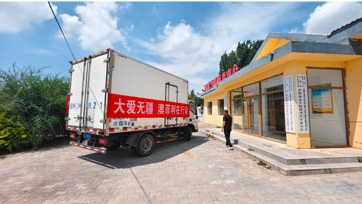 捐贈(zèng)現(xiàn)場(chǎng),一輛懸掛“大愛無(wú)疆 澳菲利在行動(dòng)”紅色條幅的冷鏈車緩緩駛?cè)胩缀f?zhèn)永生村村委會(huì),車剛停穩(wěn),工作人員迅速將一箱箱羊肉產(chǎn)品搬下車,整齊碼放在村委會(huì)門口,現(xiàn)場(chǎng)暖意涌動(dòng)。