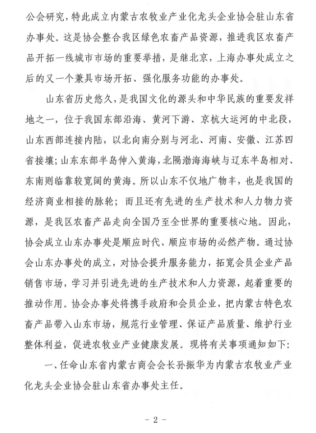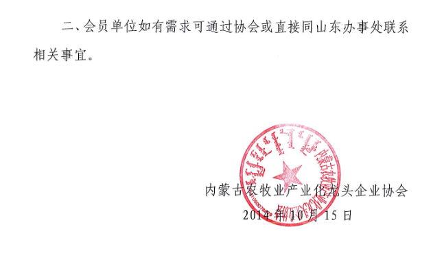 關(guān)于成立內(nèi)蒙古農(nóng)牧業(yè)產(chǎn)業(yè)化龍頭企業(yè)協(xié)會(huì)駐山東辦事處的通知