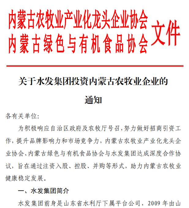 關(guān)于水發(fā)集團(tuán)投資內(nèi)蒙古農(nóng)牧業(yè)企業(yè)的通知