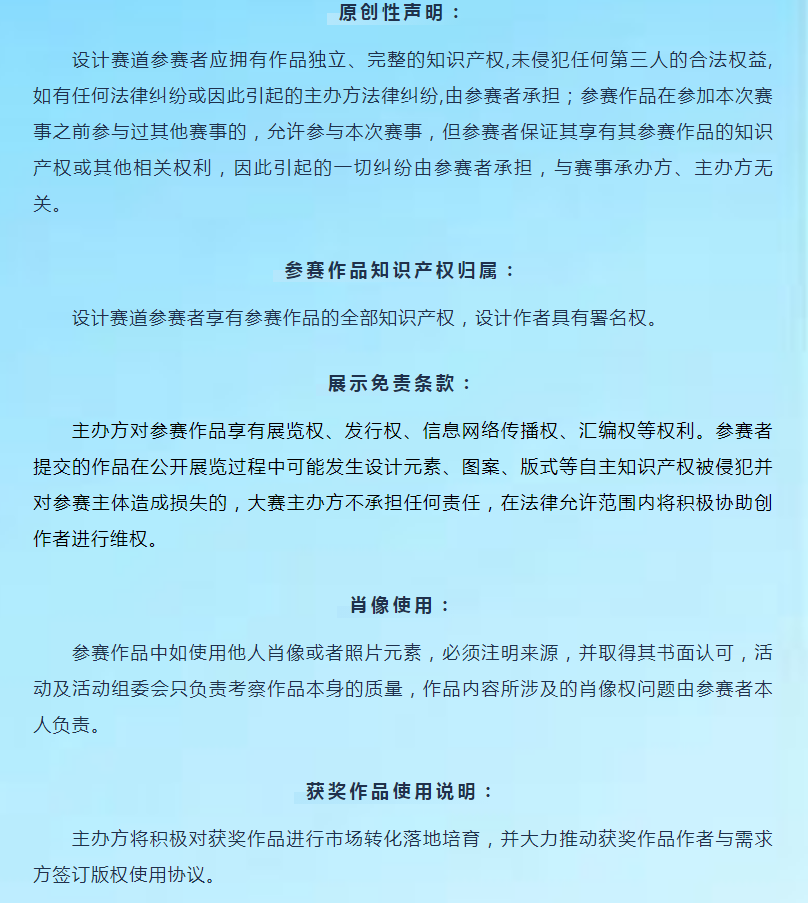 設(shè)計賽道作品獎金不包含作品版權(quán),版權(quán)購買形式及費用由需求單位與獲獎作者自行協(xié)商確定。