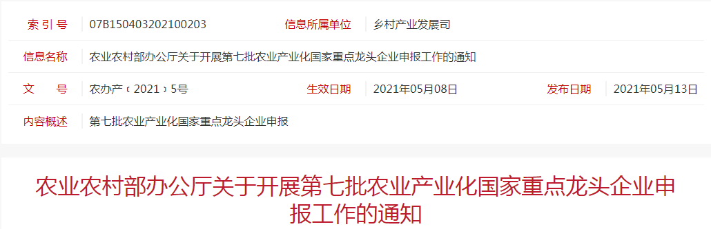 標題:農(nóng)業(yè)農(nóng)村部辦公廳關(guān)于開展第七批農(nóng)業(yè)產(chǎn)業(yè)化國家重點龍頭企業(yè)申報工作的通知