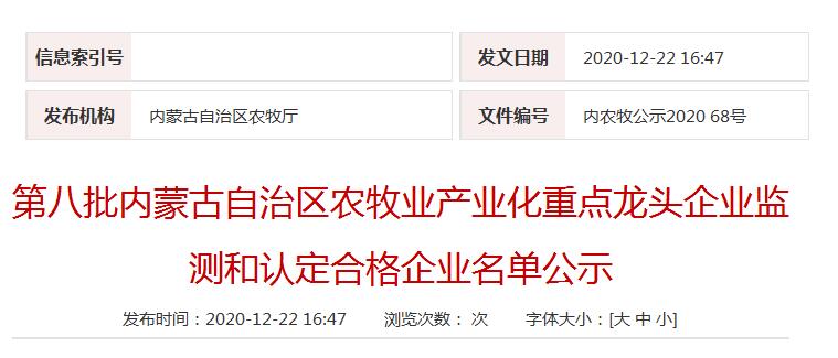 企業(yè)名稱:第八批內蒙古自治區(qū)農(nóng)牧業(yè)產(chǎn)業(yè)化重點龍頭企業(yè)監(jiān)測和認定合格企業(yè)名單公示