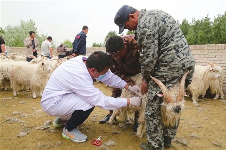 自治區(qū)纖維檢驗(yàn)局的技術(shù)人員在為鄂托克旗牧民選購的阿爾巴斯種公羊做羊絨活體檢測(cè)。
