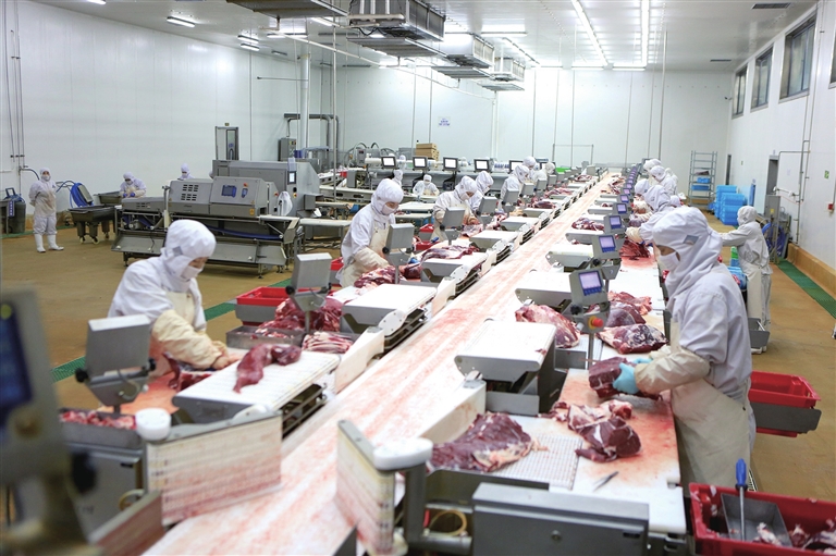 內(nèi)蒙古科爾沁牛業(yè)股份有限公司嚴(yán)格按照歐盟食品衛(wèi)生標(biāo)準(zhǔn)建立了牛肉加工生產(chǎn)流水線,形成了年屠宰 20萬頭肉牛,生產(chǎn)冷鮮、冷凍肉4萬噸的規(guī)模。該公司產(chǎn)業(yè)鏈模式建設(shè)有效帶動(dòng)了周邊農(nóng)牧民增產(chǎn)、增收。