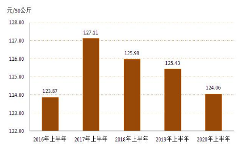 1.小麥:1、2月份春節(jié)假期疊加新冠肺炎疫情,糧企停工停產(chǎn),市場交易趨于平淡,小麥?zhǔn)召弮r格整體穩(wěn)定。3月份之后,隨著新冠肺炎疫情得到有效控制,各地復(fù)工復(fù)產(chǎn)復(fù)學(xué)的大范圍推進(jìn),截止12月份全區(qū)小麥每50公斤平均收購價格為124.06元,同比下降1.09%,詳見圖3。(來源:內(nèi)蒙古自治區(qū)發(fā)展和改革委員會)